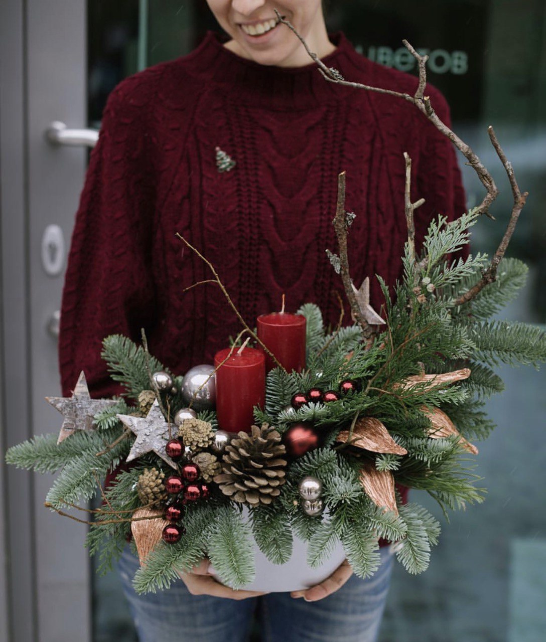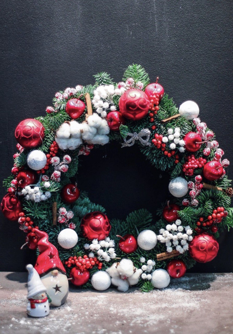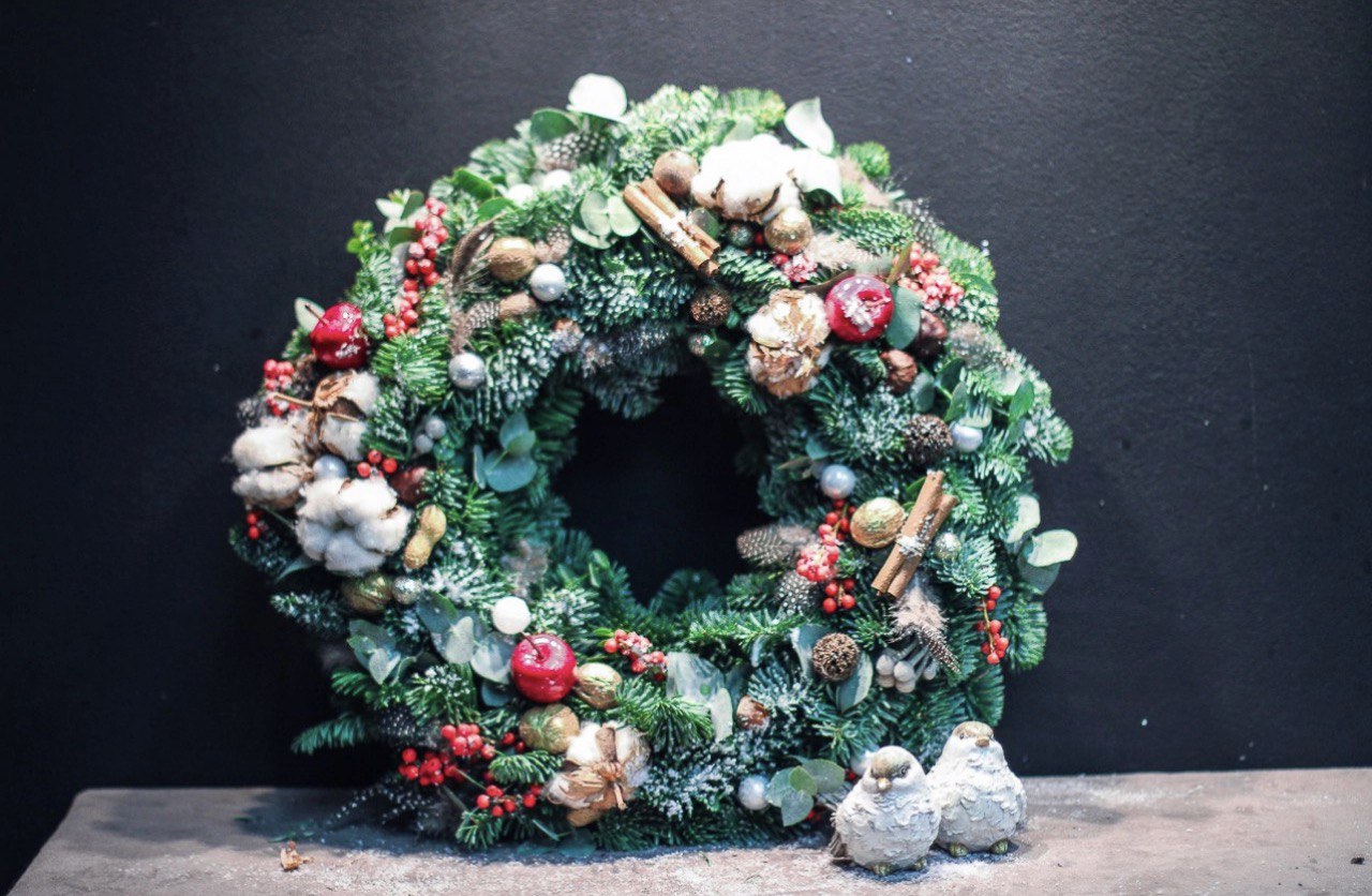 Вас ждет: живой лапник, туи, сосны. Сухие веточки, шишки, сушеные апельсины и море навогодних шариков, свечей и другого декора.