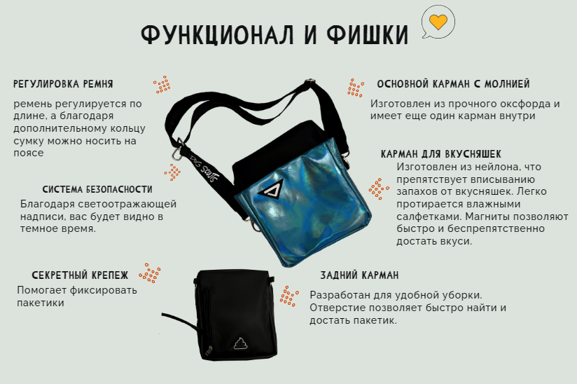 Передний карман для вкусняшек изготовлен из нейлона и застегивается на магниты.